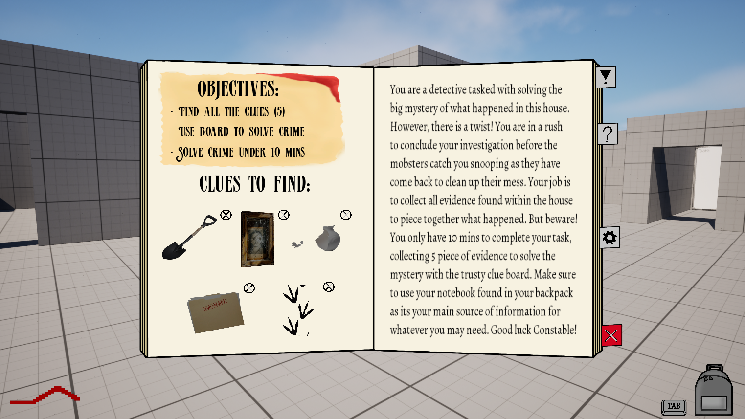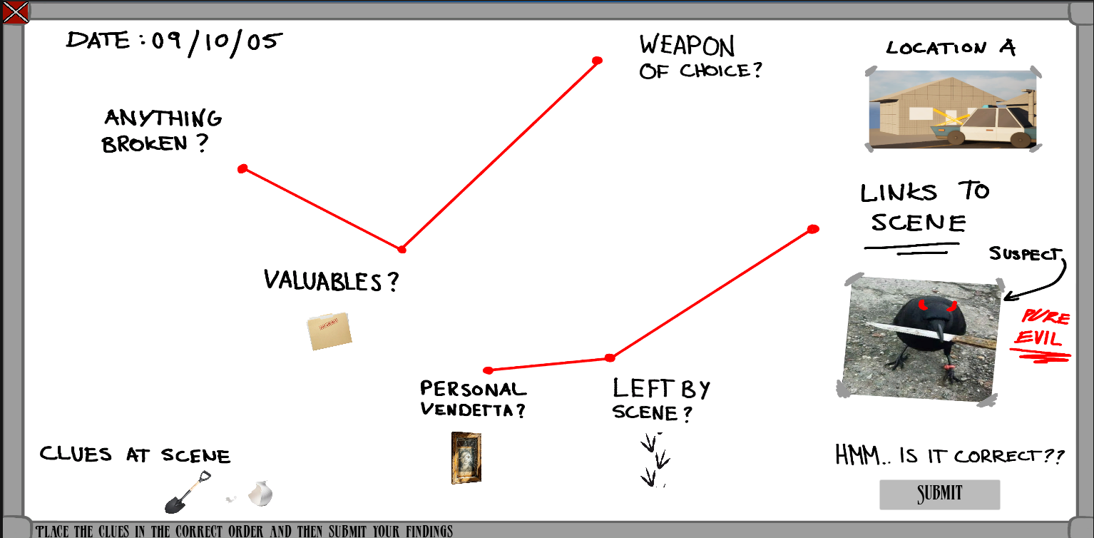 However, some elements were missed out unfortunately due to time constraints such as a way to analyse the evidence which could have been great. Also the clues to collect should have been named within the notebook and the clue board (as the clues were cubes which made it difficult to determine what each of the clues were - wouldn't be an issue if assets were used but currently would benefit to label them).