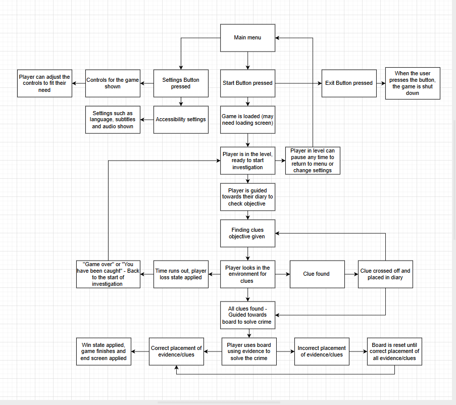 The prototype game was created in 5 weeks as part of my university game design specialism module that involved research into what the role of UI/UX Designer required which influenced the overall project (such as the tools used for the games UI as well as planning the creation of the project e.g. Figma and Photoshop used for flowchart and UI element creation). The production involved the creation of the players HUD, Win/Loss Screens, Menus such as the main menu/notebook, mechanics such as pickup/inventory system for the clue gathering and a drag and drop system so the clues can be placed on the clue board to solve the crime.